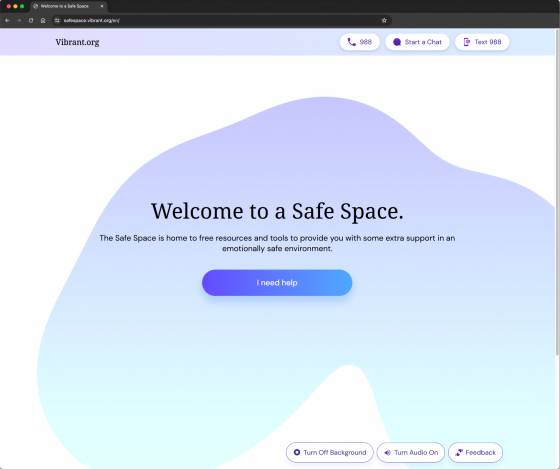 Safe Space is a repository of free resources and tools for extra emotional support while callers are on the line with 988 Suicide & Crisis Lifeline, administered by Vibrant Emotional Health.